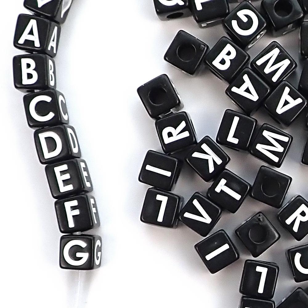 Plastic black number cube beads with vertical holes that run from top to bottom. These number beads are commonly used for making key chains, jewelry, accessories, ornaments and decorations. Number beads can be used with alphabet beads to spell team names and special sayings. These beads can be strung with other beads s