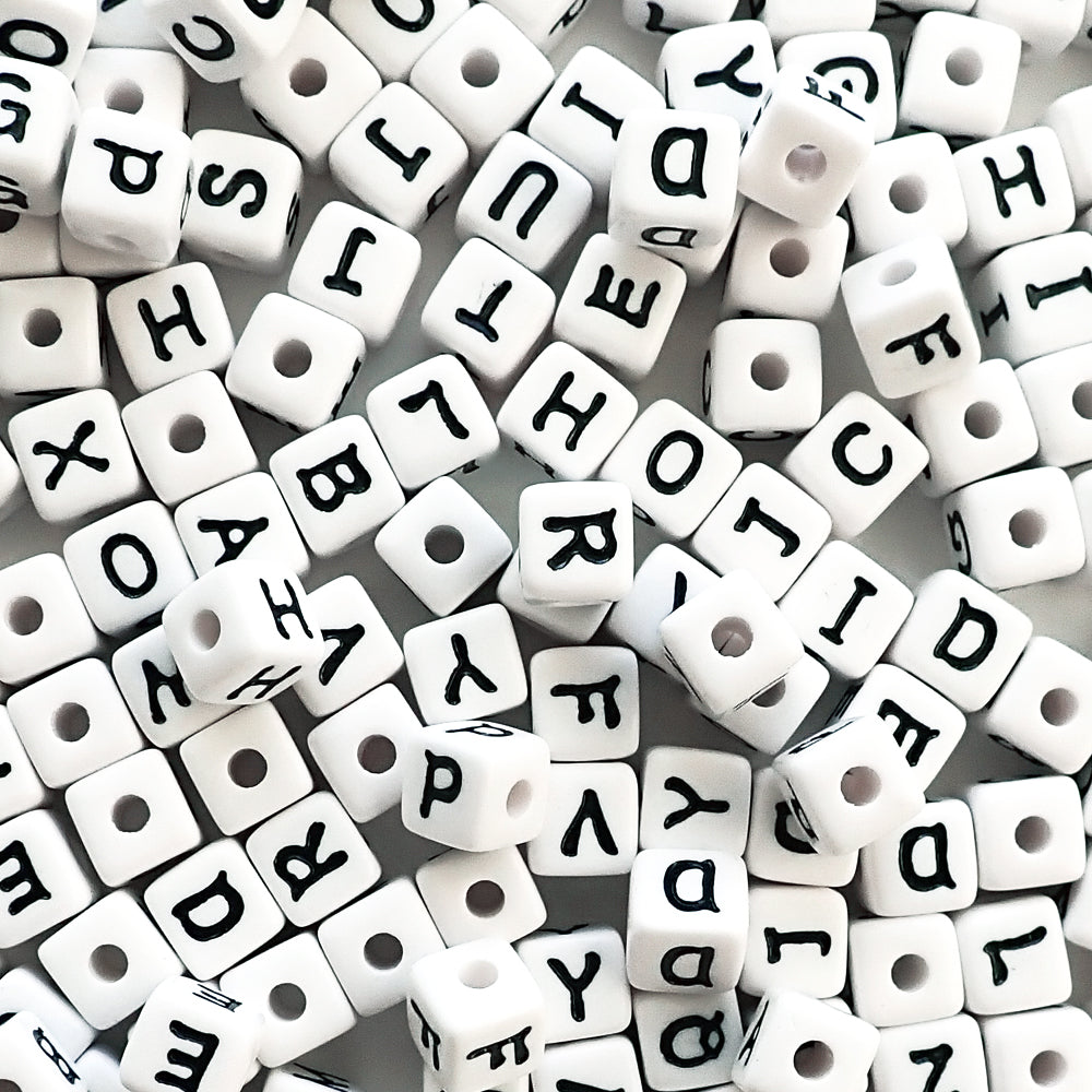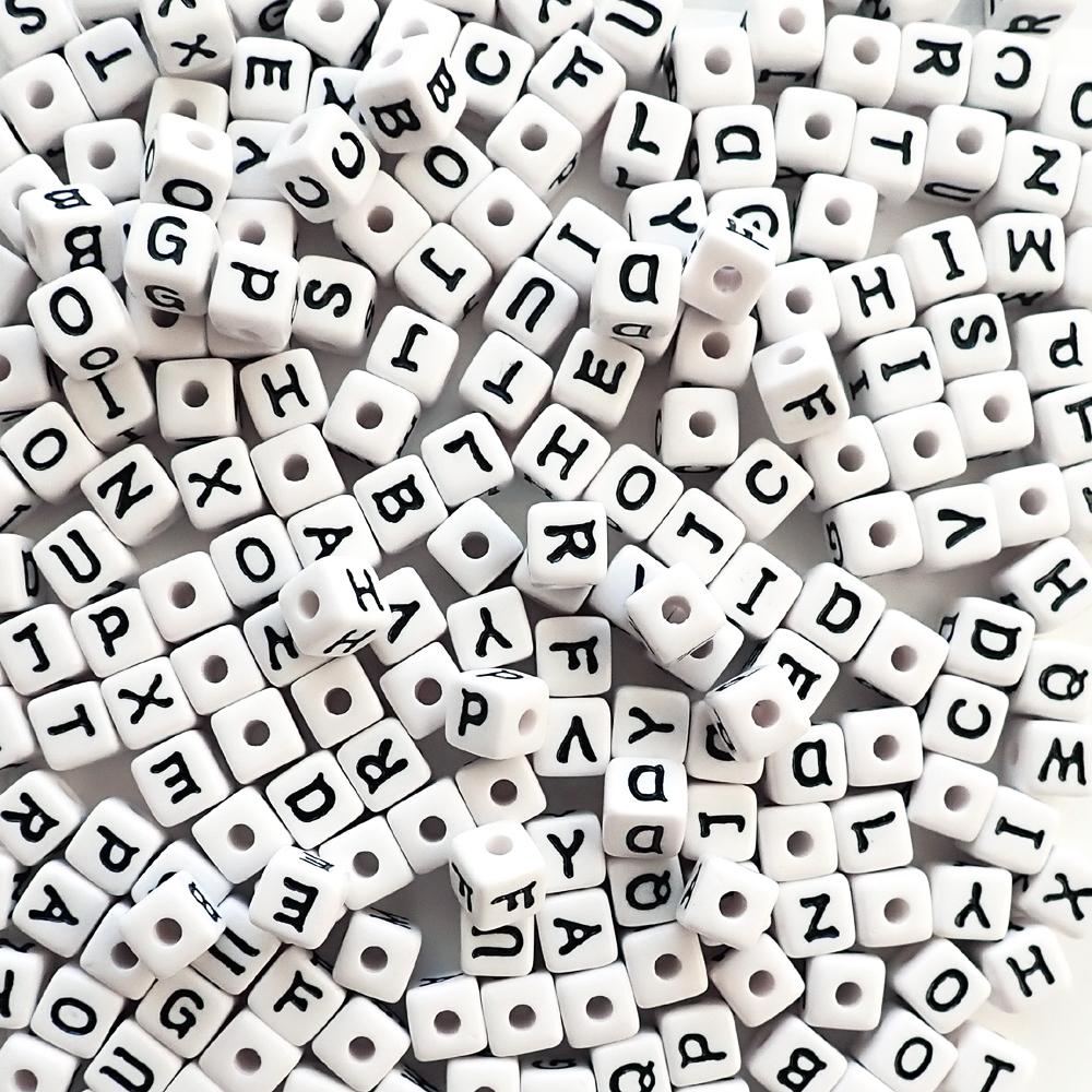 Plastic White 11mm Cube Alphabet Beads, Random Mix, (Horizontal Hole), 300 beads
